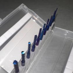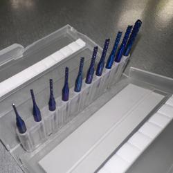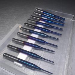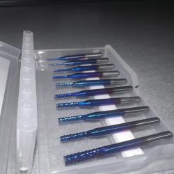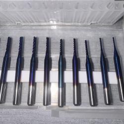 10бр CNC фрези от волфрамов карбид с нано покритие, намаляващо триенето и топлината при работа, като по този начин удължава експлоатационния живот на инструмента. Спираловидните срезове с двоен връх на инструмента осигуряват прецизен, чист и бърз срез, като отвеждат по бързо отнетия материал от работната част. Използват се предимно с машини, които имат компютърно цифрово управление (CNC, PCB, SMT) но също така и с редица ръчни ел. ротационни машинки. За материали като PCB платки, карбонови елементи, перциглас и др пластмаси, дърво и меки метали. Диаметър на работната част: 0,8 / 1 / 1,2 / 1,4 / 1,6 / 1,8 / 2 / 2,2 / 2,5 / 3 Основа за захват 3.175мм (1/8”) Дължина 36-37мм