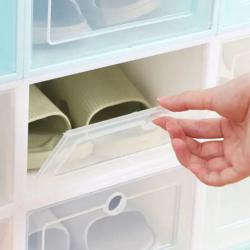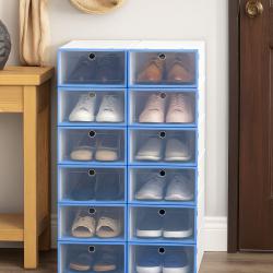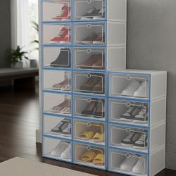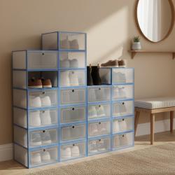Материал: устойчива пластмаса Размери: 14 x 24 x 34 cm (на една кутия) Цвят: прозрачен корпус със син кант Вентилация: вградени отвори за циркулация на въздуха Свързване: кукички за стабилно подреждане една върху друга Поддръжка: бързо почистване, разглобяеми при нужда Вместимост: подходящи за обувки, кухненски аксесоари, прибори, гъби, подправки, дребни съдове, торби и др. Пакетът включва: 12 x SHOEZY кутии за съхранение Безопасност: без остри ръбове, безопасни за дома и деца Допълнителни функции: леки, преносими, стабилни при подреждане