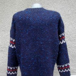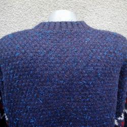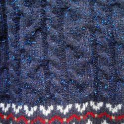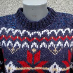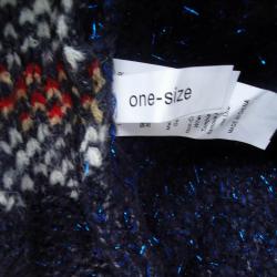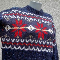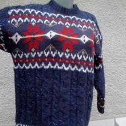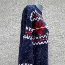 Много красив пуловер със синя блестяща нишка По етикет е размер O/S (универсален размер), но ако трябва да съм по – конкретна, отговаря на 3XL. Точни мерки БЕЗ разтягане: Дължина -74см. Ширина 2х60см., но се разтяга доста и най – добре стои на дами с размер на гръдна обиколка и ханш между 124/128см. Ръкав от врата – 78см. Нов. Без етикет. Още мои дрехи с големи размери в блога ми: https: //modamaxi. wordpress. com/