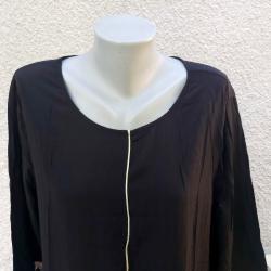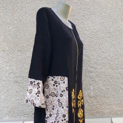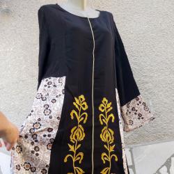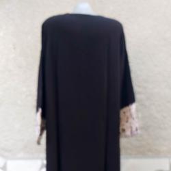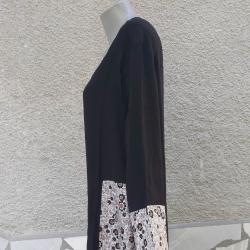 Дълга до земята рокля със силен черен акцент отпред, който оптически придава на модела по – издължен силует. Материята не е еластична Състав: 35% памук, 65% полиестер Размерът на етикета е 2XL, но според мен е малко по - голяма Точни мерки: Дължина -136см. обиколка на бюста - 120см. обиколка на ханша 140см. Нова. Без етикет. Още мои дрехи с големи размери в блога ми: https: //modamaxi. wordpress. com/