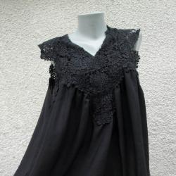В наситено черен цвят, от тънка полиестерна материя. С много лека прозрачност, която по - скоро загатва силуета от долу, без да го очертава. Силно се разширява към ханша и стои много добре. С (предполагам) памучна дантела, сякаш плетена на една кука. Точни мерки: Дължина -76см. шир. при подмишниците 2х63 см. шир. при ханша 2х82 см. Нова. Без етикет.