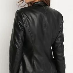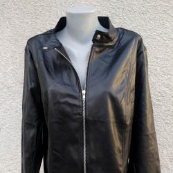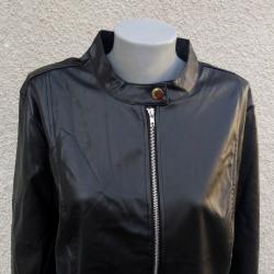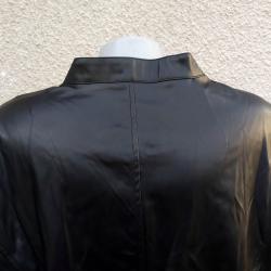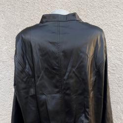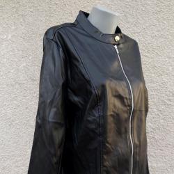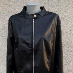 Яке в наситено черен цвят. Състав: 100% Полиестер (PU кожа) От доста фина кожа и без джобове. За това е желателно да се носи по – прилепнало над тънка блуза, а не върху дебел пуловер. Имам същото и го нося по – скоро като сако, а през зимата върху него слагам палто защото не е дебело. По етикет е размер 4XL, но е умалено и по таблицата за дрехи, която ползвам аз, отговаря на 3XL Има лека еластичност Точни мерки БЕЗ опъване: Дължина -67см. шир. при подмишниците 2х63см. шир. при талията 2х60см. шир. при ханша 2х63см. Ръкав от рамото – 63см. Тези и още много други дрехи с големи размери в блога ми: https: //modamaxi. wordpress. com/