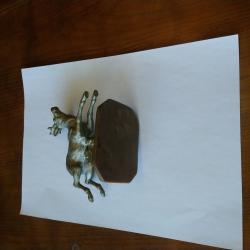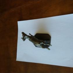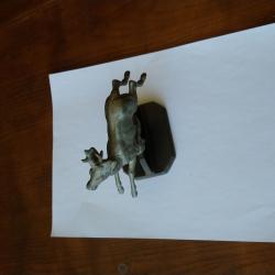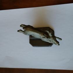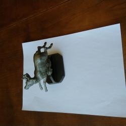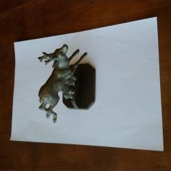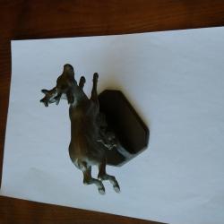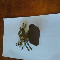 Алуминиева фигура на благороден елен. Отливка. Основата е изработена от текстолит. Оградата и еленът са отлети от алуминий. Габаритни размери на фигурата 230*65*125 мм..Произход България около 1960 г.