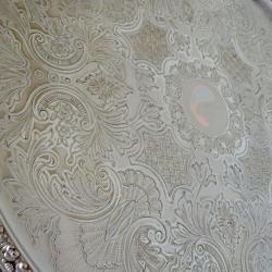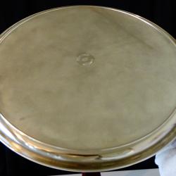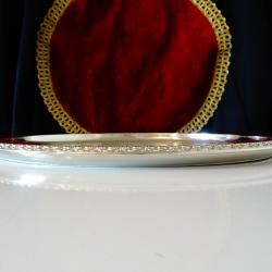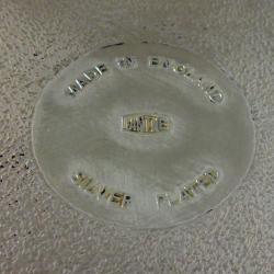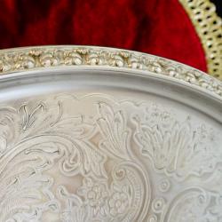 Стар меден поднос, плато, съд за сервиране, табла, изработен от масивна чиста мед, дебело посребрен с висока проба сребро, родиран за блясък и трайност. Маркиран с печат Ianthe/Made in England/Sylver Plate. Компанията е създадена през 1950 година в Бирмингам и работи до 1970 година. Изработката на подноса отразява характерната за марката английска елегантност, декориран с викториански приказно красиви релефно гравирани орнаменти и рози по периферията. Диаметър 29 см., височина 1.5 см., тегло 820 гр.