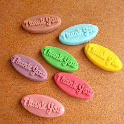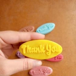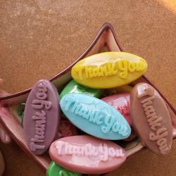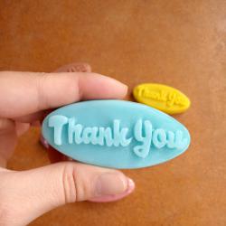 Декоративни подаръчни сапунчета с релефен надпис ‘Thank You’. Авторски модел с уникален дизайн от Atelier ABCarving. Идеални за благодарствен жест към гости. Предлагат се в разнообразие от ярки и пастелни цветове. Глицеринови сапунчета с надпис „thank you“, подходящи за подаръци за гостите на вашата сватба, кръщене или просто да благодариш. Изработени са от сапунена база с натурални масла и аромати. Кажете едно стилно и ароматно „Благодаря“ на своите гости с нашите авторски сапунчета Thank You. Този модел е създаден, за да превърне малкия жест на благодарност в незабравим спомен. Дизайнът се отличава с модерен, релефен надпис, който изпъква елегантно върху гладката овална повърхност. Всяко сапунче е плод на нашето ателие – от графичното оформление до изработката на собствените ни молдове в Atelier ABCarving. Малкият им размер ги прави изключително подходящи за подаръци при всякакви поводи: сватби, кръщенета, момински партита или като комплимент към клиентите на вашия бизнес. Използваме висококачествена глицеринова база, която позволява да предложим сапунчетата в богата и наситена гама от цветове – от нежно розово и слънчево жълто до освежаващо тюркоазено. С Atelier ABCarving вашето благодарствено послание ще бъде не само красиво, но и поднесено с аромат и внимание към детайла. Характеристики: размер: 7 по 3 см. тегло около 20 гр. цвят: бял, розов, жълт, червен, син, лилав, зелен, кафяво аромат: люляк, роза, магнолия, мед и мляко Преглагаме ги в сетове от 10, 20 или 50бр. Ако желаете различен брой, не се колебайте да се свържете с нас. Освен това може да си поръчате и друг надпис. https: //atelierabcarving. com/kontakti/