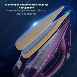 Мощност: 2400 W (бързо загряване < 1 мин); Тип работа: безжична (на база) и с кабел; Плоча: двуслойна керамична, незалепваща, за равномерно плъзгане; Резервоар за вода: ~360 мл; Режими: парно гладене / сухо гладене; Пара: силен парен удар, многоточково разпределение; Регулиране: селектор за найлон, коприна, вълна, памук и лен; Функции: анти-капка, анти-котлен камък, самопочистване, спрей за предварително навлажняване; Безопасност: защита от прегряване / авто-прекъсване на водния поток; Комплект: ютия, зарядна база/стойка, чашка за пълнене, ръководство; Цветове: лилав, зелен, син; Гаранция: 12 месеца.