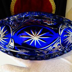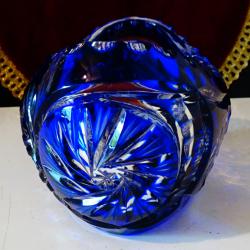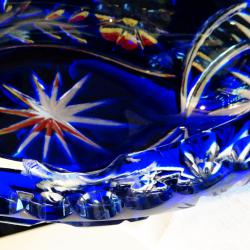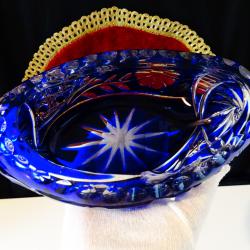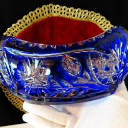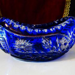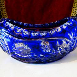Стара кристална бонбониера, гондола, кобалтов оловен кристал, ръчно шлифована, тежка, блестяща. Бонбониерата има забележка от вътрешната страна, която е снимана – гладка без режещ ръб, не се вижда. Височина 10 см., дължина 20 см., ширина 12 см., тегло 1030 гр.