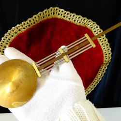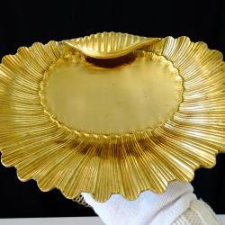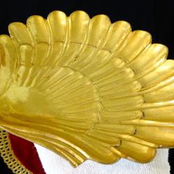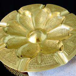 Старинен поднос, майсторска ръчна изработка от масивен златен бронз. В центъра на подноса има релефно гравирана картина с множество сцени от древен Египет – фараони, жреци, различни ритуали, галера във водите на река Нил. Ефектно декориран по края с ръчно отлят бронзов бордюр с релефни барокови орнаменти. Подноса има две масивни релефни бронзови дръжки. Толкова блестящ, че едвам го снимах и също като огледало отразил двете малки пирончета на стената ми…Възхитителна изработка. Височина 2 см., дължина 49 см., ширина 28 см., размер на дъното 34 х 24 см. Тегло 900 гр.