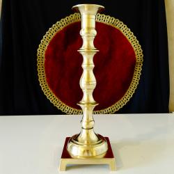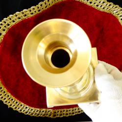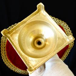 Стар японски свещник, ръчно отлят от високо качествен масивен бронз с позлата. Има ефектен релефен дизайн във викториански стил и квадратна основа повдигната на четири елегантни крачета, като реверанс към Айфеловата кула. Свещника е маркиран с релефен печат Japan. Височина 25 см., диагонал на основата 12.5 см., тегло 410 гр.