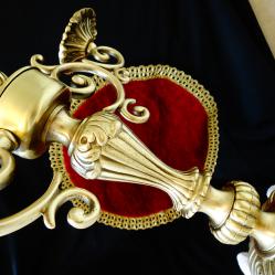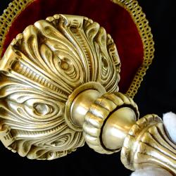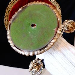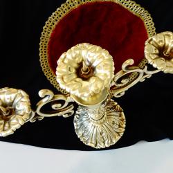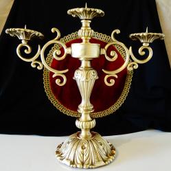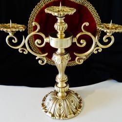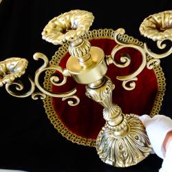Стар троен свещник, свещник за три свещи, свещник с три гнезда, майсторска ръчна изработка от свръх масивен високо качествен бронз. Величествен свещник, декориран с разкошни релефни барокови орнаменти. Стилен, съвършено изпипан с впечатляващ златен блясък, вечен. Инвестиция в непреходна красота и радост за поколения. Основата има меко кадифе. Височина 33 см., дължина 33 см., диаметър 14 см., тегло 2780 гр.