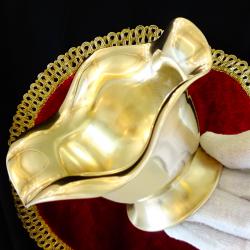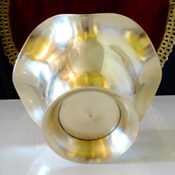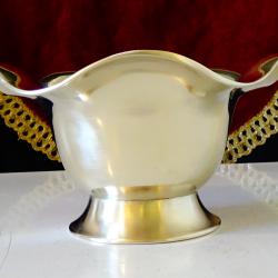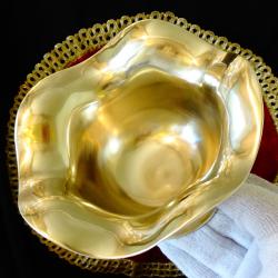 Стара бонбониера, купа, съд за сервиране, ръчно отлята от масивен високо качествен бронз. Елегантно повдигната на пиедестал, декорирана с вълнообразен релеф, блести като златна от вън и от вътре. Маркирана с релефен печат Versilbert. Вечен съд, произведен през 60-те години на миналия век, идеален за ползване, декорация и подарък. Височина 7.5 см., диаметър 13 см., тегло 280 гр.
