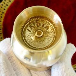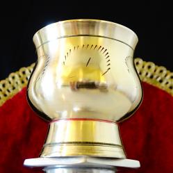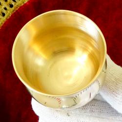 Стара чаша на столче, за ракия, ликьор, ръчно изработена от масивен бронз, декорирана с релефно гравирани флорални мотиви. Маркирана с релефен надпис India. Блести като златна от вън и от вътре, звъни приятно. Височина 4.5 см., диаметър 4.5 см., тегло 40 гр. Вместимост 50 мл.