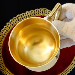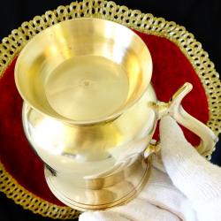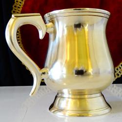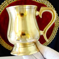 Стара чаша за вино, халба, майсторска ръчна изработка от масивен бронз с високо качество, гладкост и ретро дизайн. Блести като златна от вън и от вътре, звъни като празнична камбанка. Стои стабилно повдигната на столче за да запазва за дълго време температурата на напитката. Има ефектно извита масивна дръжка. Вечна чаша произведена през 60-те години на миналия век. Височина 10 см., диаметър 7.5 см., тегло 190 гр., вместимост 200 мл.
