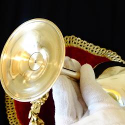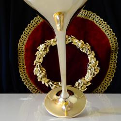 Елегантна чаша за вино, шампанско, бокал, майсторска ръчна изработка от масивен високо качествен бронз с позлата. Изключително стилна чаша в перфектно състояние с ослепителен златен блясък от вън и от вътре и мелодичен звън. Идеална за ползване, декорация и подарък. Височина 20.5 см., диаметър 8.5 см., тегло 280 гр. Вместимост 280 мл.
