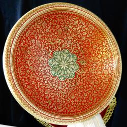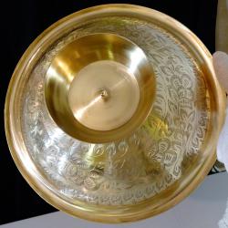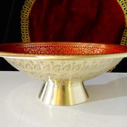 Стара повдигната фруктиера, салатиера, купа за сервиране, майсторска ръчна изработка от масивен високо качествен бронз, маркирана за производител. От вътре фруктиерата е декорирана с прецизно изваяни релефни риби, лози със зряло грозде и орнаменти – символи на християнството, Христос, плодородие, изобилие и просперитет. Блестят като златни на ярък фон от цветен клетъчен емайл. От вън е релефно гравирана с красиви флорални мотиви. Вечен съд, истинско произведение на изкуството, отлична инвестиция в красота, която ще носи радост и изтънченост години наред. Височина 9 см., диаметър 25 см., тегло 700 гр.