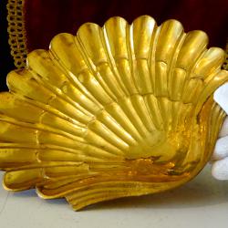 Стара фруктиера, бонбониера, купа, съд за сервиране, съд за сервиране на стриди, ръчно отлят от свръх масивен бронз, дебело позлатен с 24 карата злато. Има ефектен релефен бароков дизайн - перлена мида, вдъхновен от картината на Ботичели „Раждането на Венера”. Вечен съд с блясък на златно огледало, идеален за ползване, декорация и подарък. Инвестиция в красота и радост. Височина 2.5 см., дължина 19 см., ширина 16 см. Тегло 500 гр.