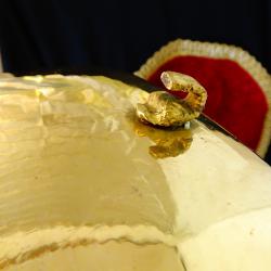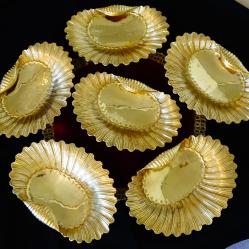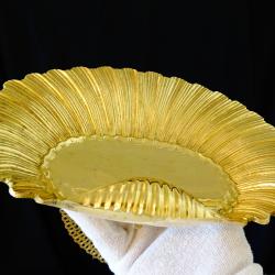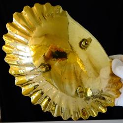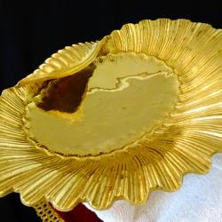 Стара фруктиера, бонбониера, купа, съд за сервиране, съд за сервиране на стриди, ръчно отлят от свръх масивен бронз, дебело позлатен с 24 карата злато. Има ефектен релефен дизайн на перлена мида, вдъхновен от картината на Ботичели „Раждането на Венера”. Стои стабилно на три бронзови крачета, изваяни като фигурки на риба, символ на християнството. Разкошен, вечен съд с блясък на златно огледало, идеален за ползване, декорация и подарък. Инвестиция в красота и радост. Височина 4.5 см., дължина 23 см., ширина 16 см. Тегло 560 гр. Налични 6 броя, цена 29.99 €., за брой.