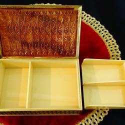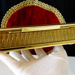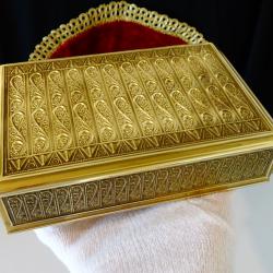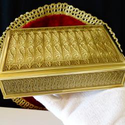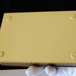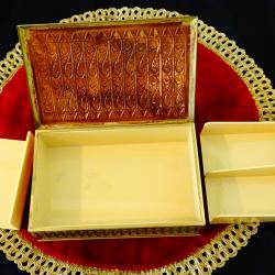 Немска кутия за пури, цигари, бижута, майсторска ръчна изработка от високо качествен бронз с дебела позлата на западно германската компания Erhard & Söhne. Кутията е декорирана с приказно красиви и прецизно изваяни релефни орнаменти в стил Art Nouveau. Вътрешното пространство на кутията е секционирано с подвижни прегради и може да се организира според предназначението – определено немски образец..!Размер 16.5 х 11 х 4.5 см. Тегло 390 гр.