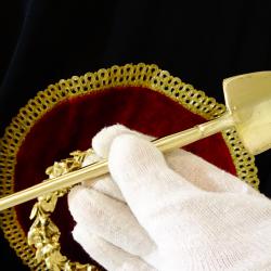 Стара лопата, лопатка, градинарски инструмент за саксийни цветя, бонсай, кактуси и сукуленти, ръчно отлята от високо качествен масивен бронз със златен блясък. Вечен инструмент. Дължина 19 см., ширина 4.5 см., тегло 60 гр. Имам поставка гюм и гребло, които може да разгледате в моите обяви.