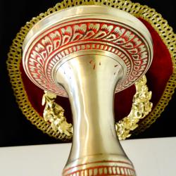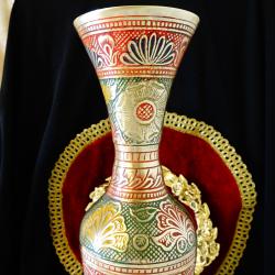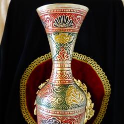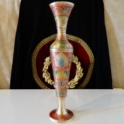 Стара ваза, майсторска ръчна изработка от масивен високо качествен бронз. Декорирана с безброй релефни цветя, флорални мотиви и орнаменти, ефектно подчертани с цветен клетъчен емайл. Богата палитра от ярки цветове се съчетава с блясъка на златен бронз във вечна творба, отлична инвестиция в красота, която ще носи радост и изтънченост години наред. Височина 36 см., диаметър 9 см., тегло 610 гр.