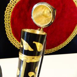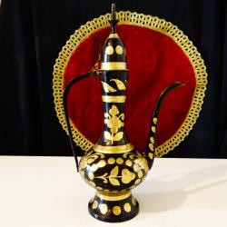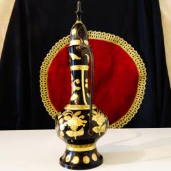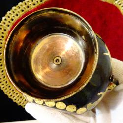 Стара бронзова ваза, свещник с дизайн на кана, майсторска ръчна изработка от масивен бронз, декорирана с релефно гравирани рози, цветя и флорални мотиви на черен фон, ефектно подчертани с дебела позлата. Височина 25 см., дължина 16 см., тегло 350 гр.