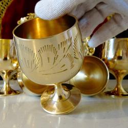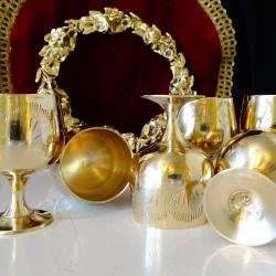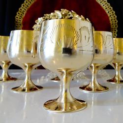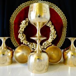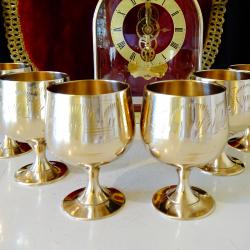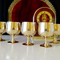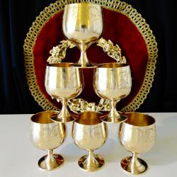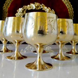 Стилен сервиз чаши за ракия, коняк, майсторска ръчна изработка от масивен високо качествен бронз с блестяща позлата. Ефектно декорирани с релефно гравирани флорални мотиви. Чашите не са ползвани в перфектно състояние, идеални за подарък. Височина 7 см., диаметър 6 см., тегло на всяка 80 гр. Вместимост 80 мл. Налични 6 броя, цена 35 лв., за брой.