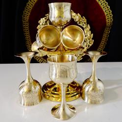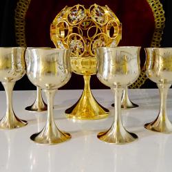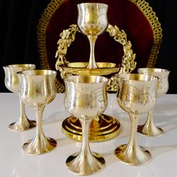 Стари чаши за ракия, ликьор, майсторска ръчна изработка от високо качествен бронз, маркирани от производителя E. P.N. S.Декорирани с красиви релефно гравирани орнаменти, чашките имат високо елегантно столче и ефектен дизайн. Не са ползвани, блестят като златни от вън и от вътре, звънят приятно. Височина 9.5 см., диаметър 4.5 см., тегло на всяка 70 гр. Вместимост 50 мл. Налични 6 броя, цена 13 € за брой.