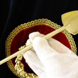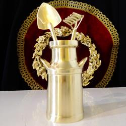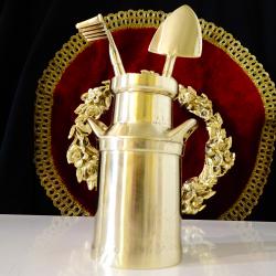 Стар градинарски комплект инструменти – гребло и лопатка със поставка гюм, майсторска ръчна изработка от масивен бронз със златен блясък. Комплекта е предназначен за саксийни цветя, кактуси, сукуленти, бонсай, зимна градина. Вечен комплект, който освен за ползване е и много ефектна декорация. - Гюм за мляко – височина 11 см., диаметър 5.5 см., вместимост 200 мл., тегло 340 гр. - Лопатка - дължина 19 см., ширина 4.5 см., тегло 60 гр. - Гребло - дължина16 см., ширина 4.5 см., височина 2 см., тегло 55 гр.