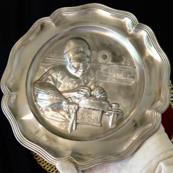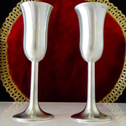 Западно германска калаена чаша за вино, майсторска ръчна изработка от 95% калай и 5% сребро, маркирана от производителя, като патентован модел. Декорирана с три прецизно изваяни релефни картини с живописни сцени от работата на пощенските служители. Представени са - Селски пощальон, Паричен пощальон и Железопътна поща. Високо качествена, масивна изработка със сребърен блясък от вън и от вътре, идеална за ползване, колекция, декорация и подарък. Отличен избор за калаена сватба. Височина 8.5 см., диаметър 6.5 см., тегло 140 гр. Вместимост 160 мл.