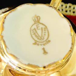 Порцеланов комплект от чаша с чиния Бавария, баварски костен порцелан, ръчно декориран с чисто злато 24 k Gold и красива роза. Порцелана е лек, декориран с най-красивия бароков релеф. Маркиран Schaller Wiesau Bavaria, датира от 1950 година.