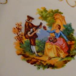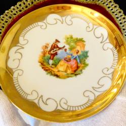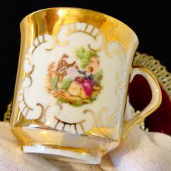 Италиански порцеланов сет от чаша с чиния, за кафе, чай, ракия, ликьор, италиански фин порцелан, ръчно декорирани с 24 карата злато и картина на френският художник Жан-Оноре Фрагонар. - чаша – височина 6 см., диаметър 6 см., вместимост 120 мл. - чиния – диаметър 12 см., височина 1.5 см. Налични 4 сета, цена 12 лв., за брой.