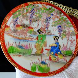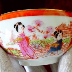 Стар порцеланов комплект от чаша с чиния, японски костен порцелан тип яйчена черупка, ръчно рисуван с гейши сред красиви японски градини и много 24 карата злато.