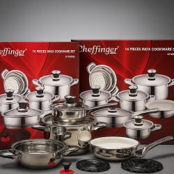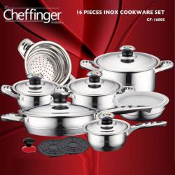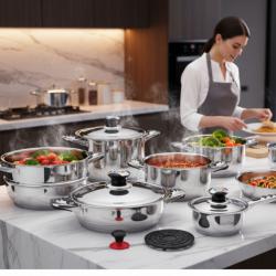 Комплект 16 части – тенджери, касероли, тигани, капаци и аксесоари за всяко ястие. Неръждаема стомана с многослойно дъно – равномерно разпределяне на топлината, без загаряне. Подходящ за всички котлони – включително индукционни. Капаци с термометър – готвите с точност, без да отваряте съда постоянно. Материал: неръждаема стомана Съвместимост: всички котлони, включително индукция Дъно: многослойно, топлоразпределящо Комплект: 16 части 4 х тенджери с капаци (различни размери) 1 х дълбок тиган с капак 1 х касерола с капак 1 х съд за пара 2 х подложки Допълнителни аксесоари; Транспортна опаковка.