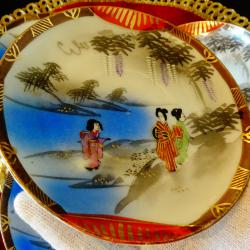 Западно Германска чиния за хапки, чиния за десерт, подложка за чаша, пано, изработена от 95% калай и 5% сребро, маркирана. В центъра има порцеланова апликация с ръчно рисувано цветно изображение на ретро кола. Диаметър 10 см., височина 1 см., тегло на всяка 75 гр. Чиниите имат запазена оригинална опаковка. Налични 3 броя, цена 10 лв., за брой.