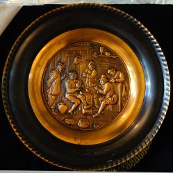 Немска чиния за хапки, чиния за десерт, купичка за ядки, подложка за чаша, пано с пейзаж литография върху неръждаема стомана от немския град Oberkirch, вграден в много качествен материал, който имитира естствено дърво. Декорирана по края с релефни листенца. Диаметър 11 см., височина 1.5 см. Тегло на всяка 60 гр. Налични 2 броя, цена 2 лв., за брой. Имам още 4 броя чинии, които може да разгледате в моите обяви.
