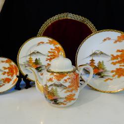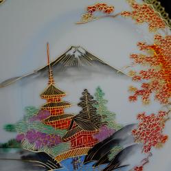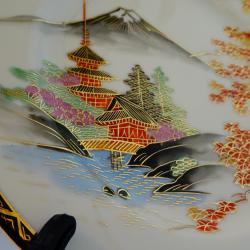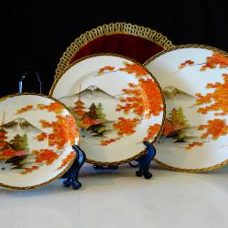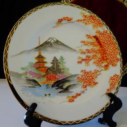 Старинна японска порцеланова чиния, японски фин порцелан истинска Сацума на школа Kazan от периода Taisho 1912-1926 г., лимитирана серия, маркирана със златни символи на черен фон. Ръчно рисувана с божестевно красив японски есенен пейзаж – кокетни къщи сгушени в подножието на планински върхове, вижда се планината Фуджи и кленови листа ярко обагрени от есента. Възхитителна палитра от