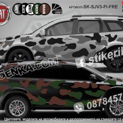 Стикер тип „камуфлаж“ - изработва се от автомобилно фолио, като представлява отделни изрязани парчета фолио и се монтират изключително лесно, едно по едно в произволна форма и шарка. Стикерите са универсални и с тях можете да облепите джип, автомобил, лодка, дори и АТВ или джет, като им предадете интересна окраска, прикриете драскотини или вдлъбнатини. Посочената цена е за 3 кв. м и до два цвята по избор. Изпращаме по Еконт.
