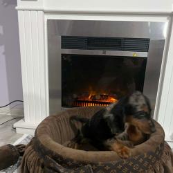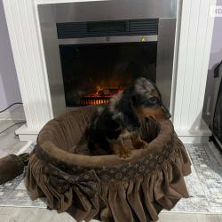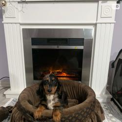 Дакел джудже с дълга козина, мерл, женски, на 9 седмици, обезпаразитен три пъти, с две ваксинации, отличен темперамент. Кученцето се предлага с чип, паспорт, клиничен преглед при ветеринарен лекар, първоначална опаковка гранули, родословие. Цена 1200e Контакт: Георги +381631074438 Руменка, Сърбия