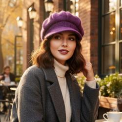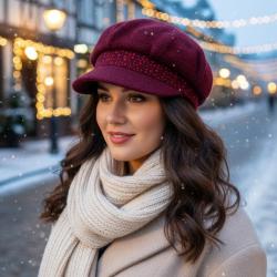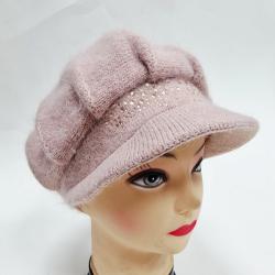 Дамска зимна плетена шапка с козирка и декоративни камъчета