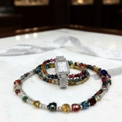 Материали: метален часовник, декоративни кристали, акрилни и стъклени мъниста, метални елементи; Елементи в комплекта: 1 часовник, 3 гривни, 1 колие; Размери: стандартна дължина на колието и гривните; компактен часовник; Цветове: многоцветни мъниста + сребрист корпус на часовника; Безопасност: хипоалергенни материали, нежни към кожата; Опаковка: подходяща за съхранение или подаряване.