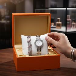 Механизъм: Кварцов (Quartz); Циферблат: Бял, с римски цифри и кристални индекси; Кейс: Кръгъл, инкрустиран с камъни; Каишка: Метална, сребрист цвят, с декоративни елементи и камъни; Гривна: Тройна редица кристали с розови камъни; Опаковка: Подаръчна кутия в оранжев цвят; Подходящ за: Ежедневие, официални събития, подарък.