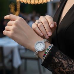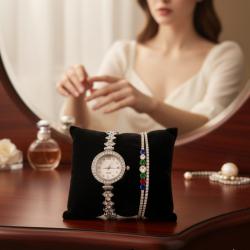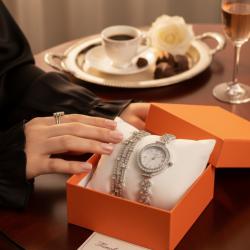 Тип продукт: Дамски комплект часовник + гривна (подаръчен сет); Механизъм: Кварцов (Quartz) – надеждна ежедневна точност; Цвят: Сребрист; Циферблат: Перлен ефект; римски индекси на 12/3/6/9; маркери с кристали; тройка стрелки; Корпус и верижка: Метална сплав с бижутерско изпълнение и инкрустирани кристали; Стъкло: Прозрачно защитно; Гривна: дизайн според наличността; Поддръжка: Почиствайте с мека, суха кърпа; Подходящ за: Сватби, балове, празници, вечерни събития и елегантно ежедневие.