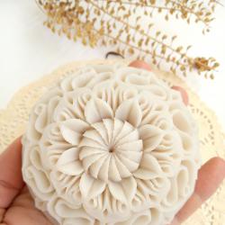 Уникален декоративен сапун, изрязан изцяло на ръка с нож. Всяка бройка е неповторим оригинал. Изискан дизайн и нежен аромат, идеален за арт подарък или колекционерска декорация. “Ръчно гравиран с внимание към детайла, изработен от сапунена база с натурални масла и аромати, сапунът е идеален подарък за любимите ви хора при различни поводи. Открийте върховото майсторство в карвинг изкуството с нашия ароматен сапун Мандала. За разлика от масовите продукти, този модел не е излят в калъп. Всеки един сапун се изрязва изцяло на ръка с нож, директно върху глицериновата база. Този процес прави всяка бройка уникално произведение на изкуството – няма две напълно еднакви мандали. Сложните геометрични форми и прецизните срезове създават хипнотизиращ релеф, който превръща сапуна в изящна декорация за вашия дом. Със своя деликатен аромат и артистично присъствие, той е перфектният избор за ценители на автентичните занаяти и за хора, търсещи неповторим, авторски подарък от Atelier ABCarving. Характеристики: диаметър: 10 см височина: 3 см / тегло: около 200 гр възможни цветове: бял, розов, жълт, червен, син, лилав, възможни аромати: люляк, роза, магнолия, мед и мляко, шоколад За повече артикули с авторски подпис, може да разгледате сайта: https: //atelierabcarving. com/