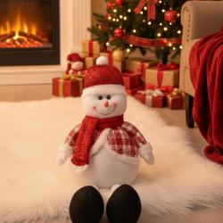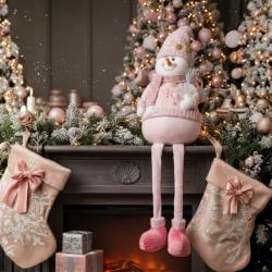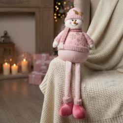 Тип: декоративна фигурка „Снежен човек“ за седяща позиция; Височина: до 80 см в най-дългия си размер (при най-опънати крака); Цветове: розов и червен; Материал: текстил/плюш с плетени елементи (шапка, шал, пуловер); Предназначение: интериорна украса – рафт, камина, перваз, бюро, витрина; Поддръжка: сухо почистване/деликатно изтупване от прах.