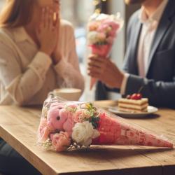 Тип продукт: декоративен подаръчен букет; Съдържание: плюшено мече + изкуствени декоративни цветя; Материали: плюш, текстил, декоративни изкуствени елементи; Опаковка: подаръчна, прозрачна; Предназначение: подарък, декорация, романтичен жест; Поддръжка: не се изисква