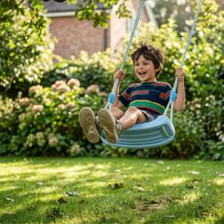 Технически характеристики на Детска градинска синя люлка – здрава, безопасна и регулируема до 75 кг Категория: Градинска люлка за деца Товароносимост: до 75 кг Материали: UV-устойчива пластмаса за седалката, здрави оплетени въжета, метални халки за захващане Устойчивост: устойчива на атмосферни влияния Размери: 44 x 17 x 8,5 см Цвят: син Поддръжка: препоръчително миене с вода и мек препарат, избягвайте агресивни химикали