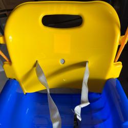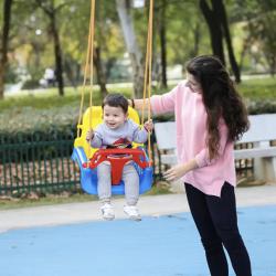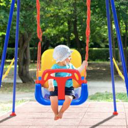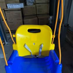 Технически характеристики на Детска люлка с облегалка 3 в 1 - максимална безопасност и комфорт Тип: Люлка 3 в 1 Материал: Висококачествена пластмаса, устойчива на влага и UV Максимално натоварване: 40 кг Размери: 43 × 35 × 38 см (седалка 35 × 23 см) Регулиране на дължината на въжето: 100–180 см Цвят: Син с цветни акценти Функции за безопасност: предпазни колани и преден парапет Сглобяване: бързо и лесно, комплект гайки и болтове, високо издръжливи въжета