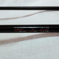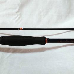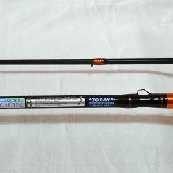 Красива и качествена пръчка, изработена от високомодулен японски TORAY карбон. В много добро състояние, с леки следи по ева дръжките. Дължина 2.45 м, транспортна дължина 1.26 м, тест по примамки 5-25 гр, FAST акция, тегло 133 гр, 10 SIC водача.