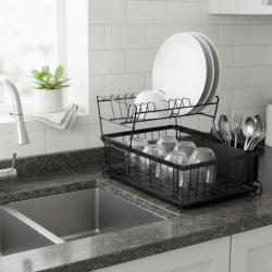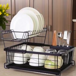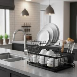 Материал: Метална конструкция; Размери / вместимост: 42,5 × 28 × 27 см / двуетажно разпределение; Дебелина / здравина: Стабилна и устойчива рамка; Поддръжка / почистване: Лесно почистване с влажна кърпа; Допълнителни функции: Отделение за прибори, S-форма за по-добра организация.