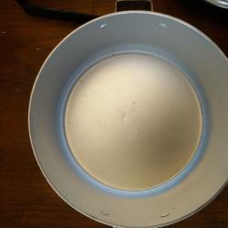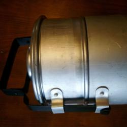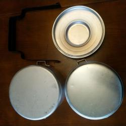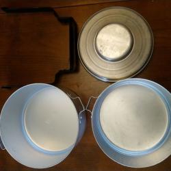 Двусекционно алуминиево канче за пренасяне на храна. Произход България около 1990 г. Габаритни размери 170*140*210 мм..Материал на канчетата алуминий. Материал на дръжката стомана. Канчето не е използвано.